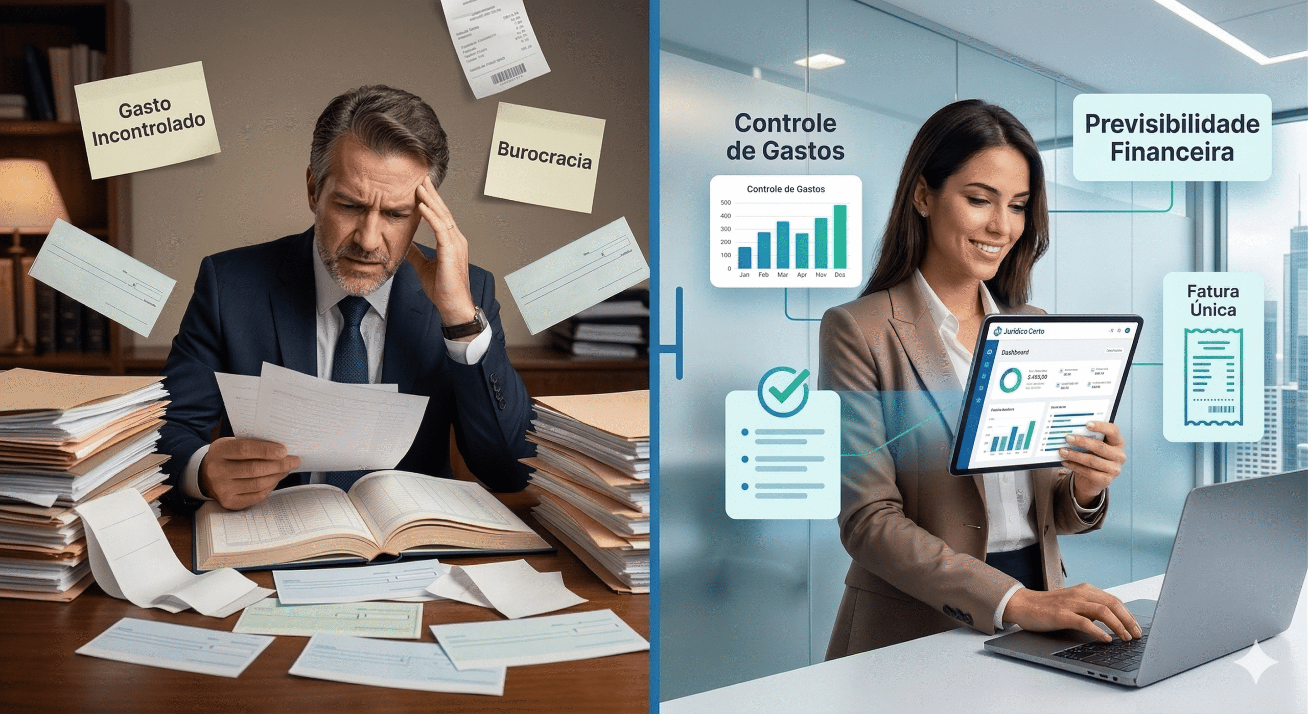 Foi para solucionar esses problemas recorrentes na advocacia que o Plano Business do Jurídico Certo trouxe duas funcionalidades estratégicas que mudaram completamente a rotina operacional e financeira do escritório: Controle de Gastos e Fatura Única de Contratações.